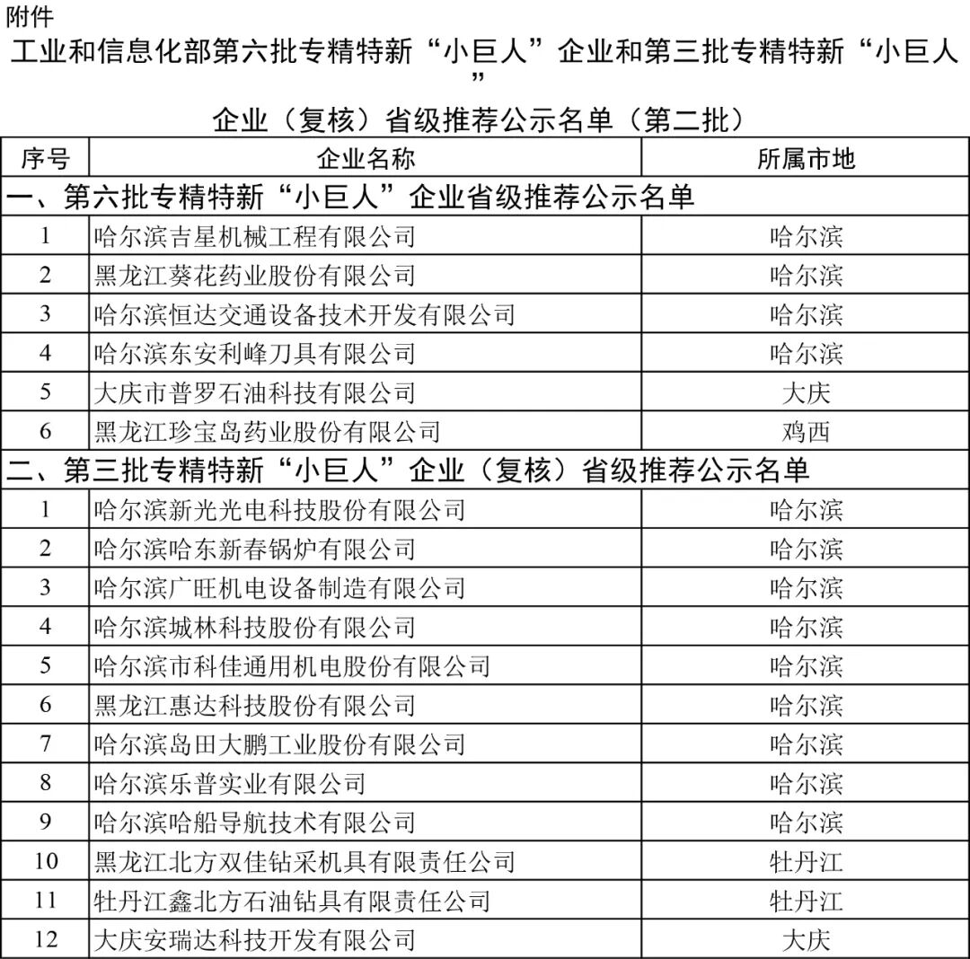 按照《黑龙江省工业和信息化厅关于开展第六批专精特新“小巨人”企业培育和第三批专精特新“小巨人”企业复核工作的通知》(黑工信企业函〔2024〕272号)要求,省工信厅在对首批推荐的46户“小巨人”申报企业和9户“小巨人”复核企业进行公示基础上,对2024年首批省级专精特新企业及2021年省级专精特新复核通过企业中满足“小巨人”申报及复核条件的进行专家初审等程序,确认补充推荐申报第六批专精特新“小巨人”企业6户、申请第三批专精特新“小巨人”复核企业12户。现将推荐名单(第二批)进行补充公示。公示期为6月19日—25日(5个工作日)。任何个人或单位如有意见,请在公示期内将书面意见反馈至gxtqyj@163.com,个人意见请署名并留联系方式,单位意见请加盖公章。联系电话:0451—82630228。